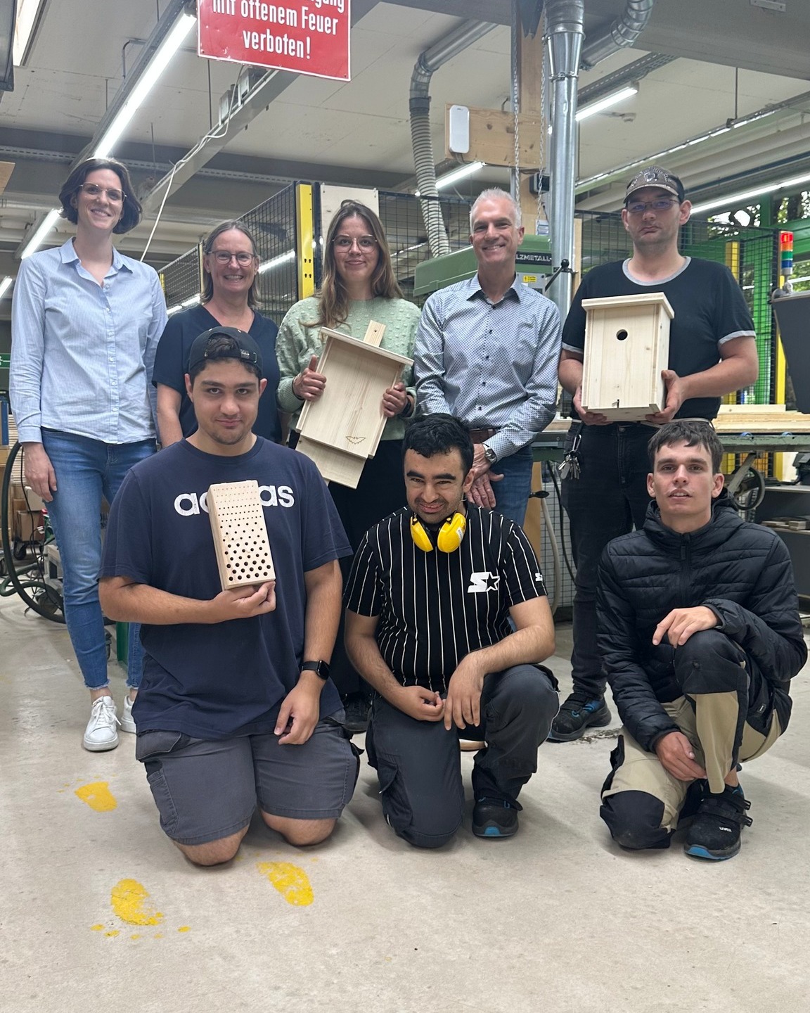 Für die Produktion wurden von unseren Schreinermeistern zuerst die nötigen Arbeitsvorrichtungen herstellt, um die Arbeit unserer Menschen mit Unterstützungsbedarf erst möglich zu machen. Dann wurden die Fertigungsschritte kleinteilig strukturiert, sodass möglichst viele Mitarbeitende mitwirken konnten. Sieben Menschen mit Unterstützungsbedarf waren beispielsweise an der Herstellung eines einzigen Nistkastens beteiligt.